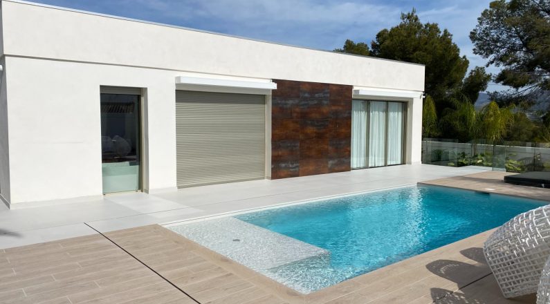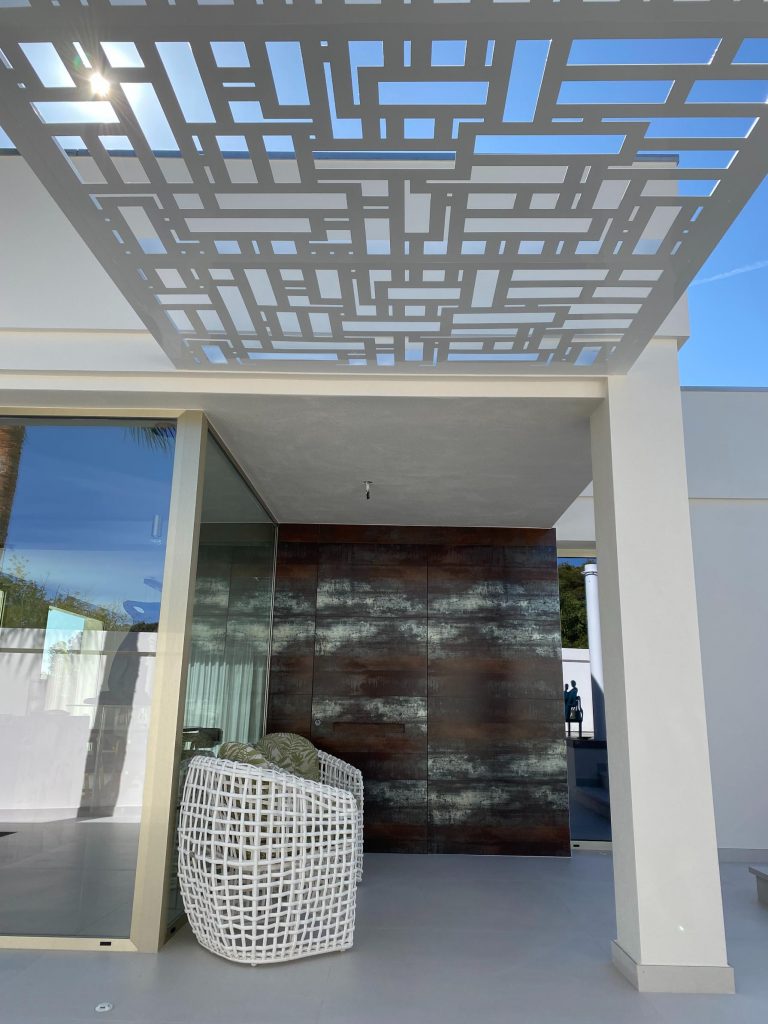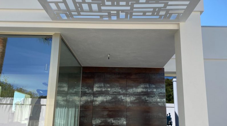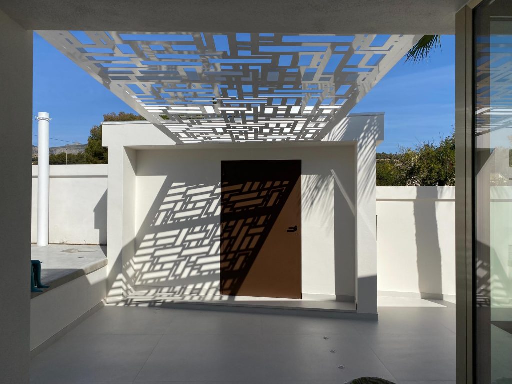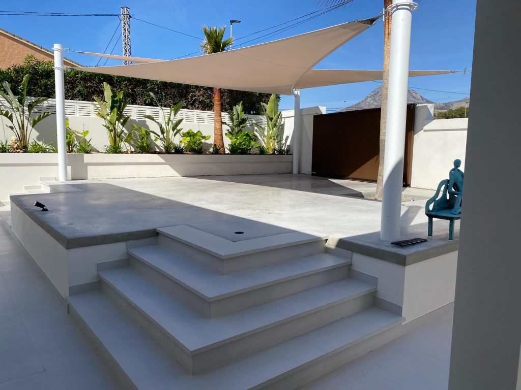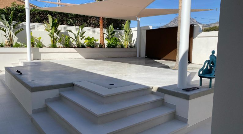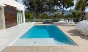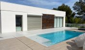 Renovatie van een rustieke Spaanse finca, getransformeerd tot een moderne woning met grote raampartijen. Het project omvatte strakke, gladde gevels, een nieuw zwembad en een schaduwrijke entree.