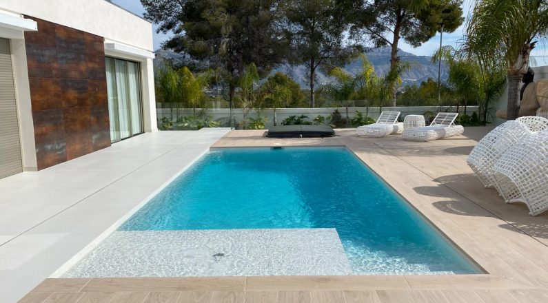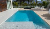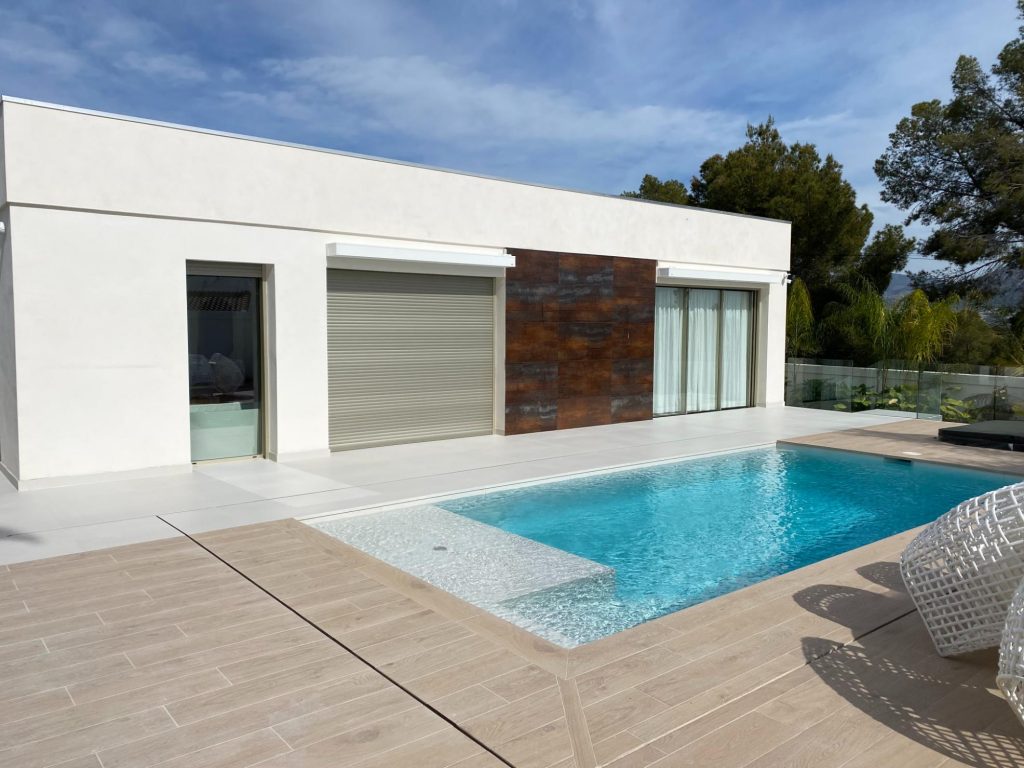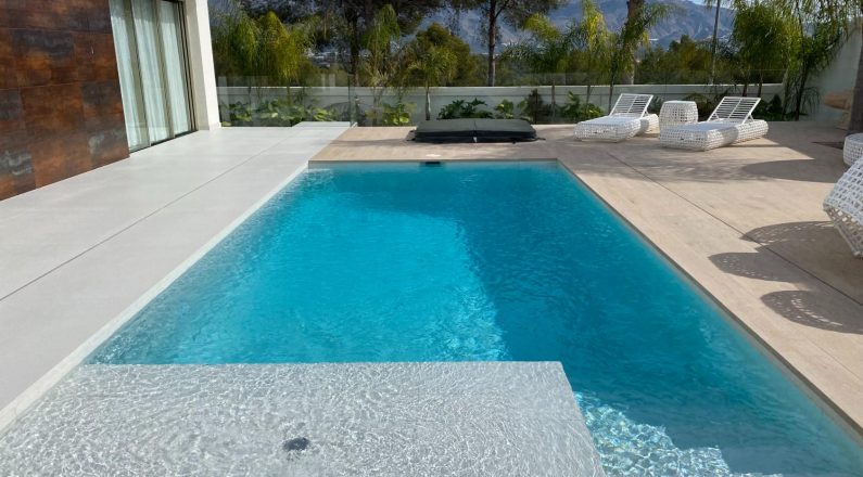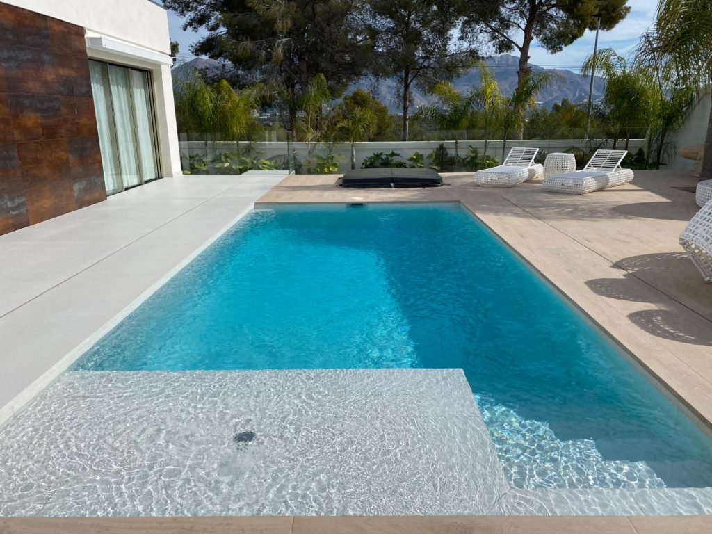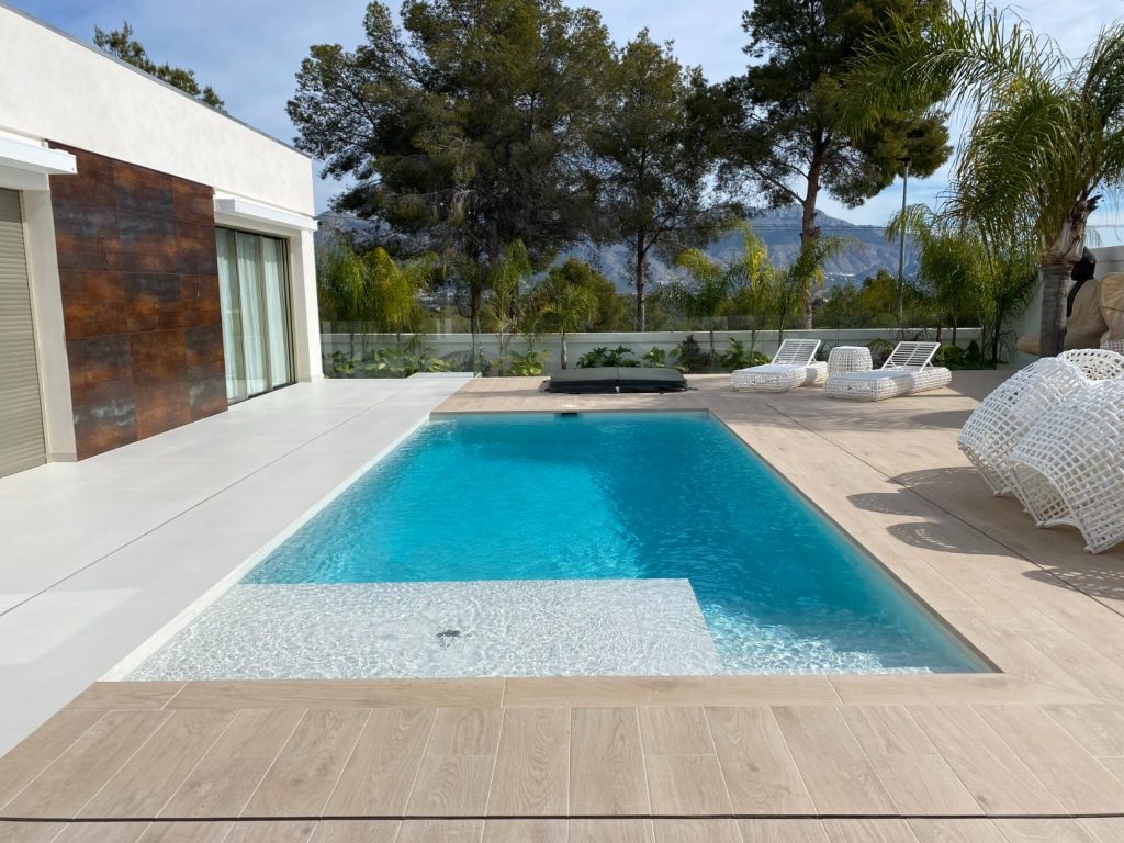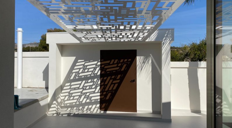 Renovatie van een rustieke Spaanse finca, getransformeerd tot een moderne woning met grote raampartijen. Het project omvatte strakke, gladde gevels, een nieuw zwembad en een schaduwrijke entree.
